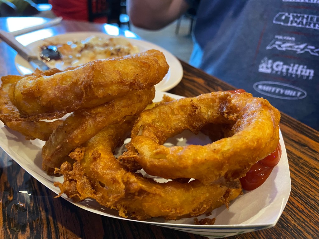 I ordered a pulled pork sandwich with a bourbon and sriracha sauce, fries, and slaw. Everything was good on this plate. My friend next to me ordered Val’s Chicken and an order of onion rings. Now the onion rings were the size of a small tractor tire and sitting right next to me. It was so hard not to grab one of those because they looked incredible. However since my friend hauled about 3000 lbs of rock on a four-hour trip up to a new house for me, I let him have them all, all the while hoping one would be left. Alas, there was no food left on any plate.