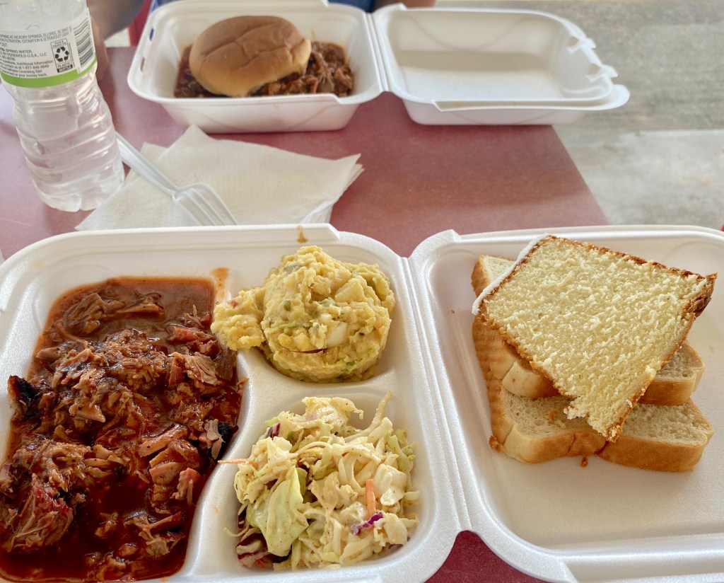 OK so going back to the quote from above, there was nothing being hidden here, just good flavor from the sauce with a good balance of sweet and tang and a little heat. The helpings of the pork were more than enough. The sides were delicious. I had potato salad and slaw. They even served a piece of delicious pound cake with the meal.