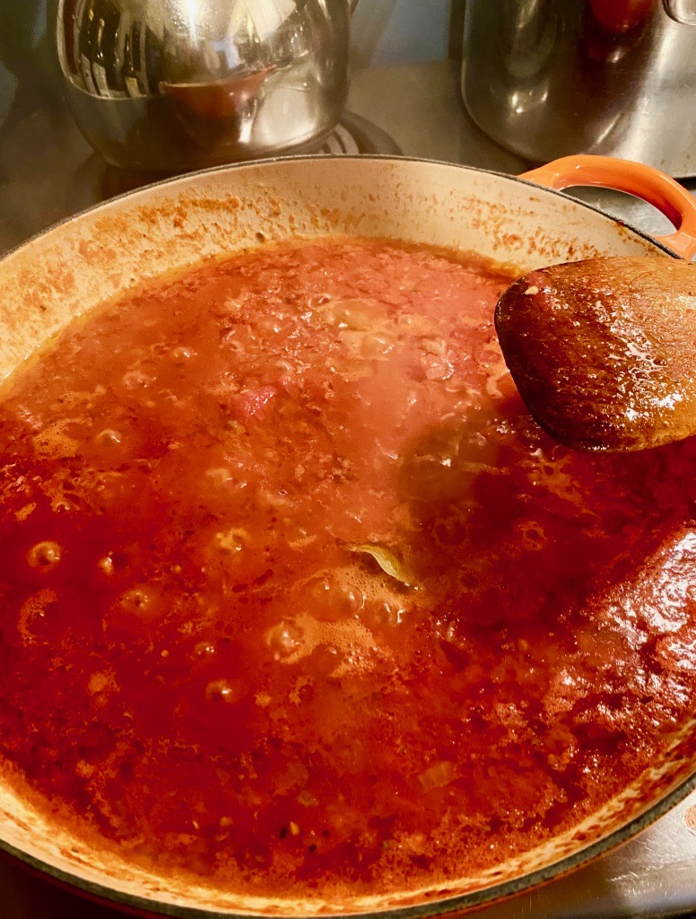 I divided the pork chop with the scallions between two plates and topped each with a slice of tomato. I placed the egg on top of the tomato with salt and pepper, topped the tomato with the egg and some green chopped scallions. To this I finished with some Maggi Hot and Sweet tomato chili sauce. This sauce is a favorite in the Big Surf house to eat with eggs.