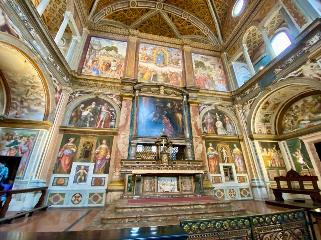 This small (by European cathedral measures) church and former convent is San Maurizio al Monastero Maggiore. It is a very special gem in the Milan necklace of sights. If you have time to visit this place, make every effort. It’s entire inside is made up of frescoes and ornate decor. It was built in the 1500’s.