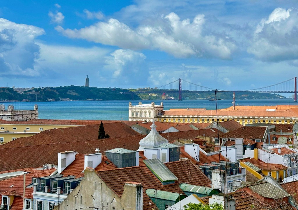 A view from atop the Lisbon Cathedral. You can see Christ the King statue on the distant hill and the suspension bridge, 25 de Abril Bridge, connecting Lisbon to Almada spanning the Tagus River.