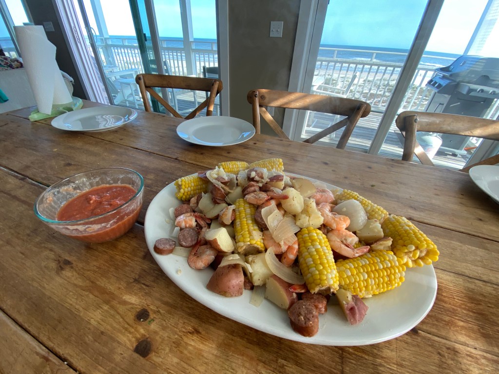 One of our traditions on a beach trip is a Big Surf Low Country Boil. It is so easy. However in our rental house there wasn’t a pot to accommodate the size of the dish, so I had to divide it into three different pots. So not as easy as usual. This makes for a nice and relaxed atmosphere to enjoy with our family.