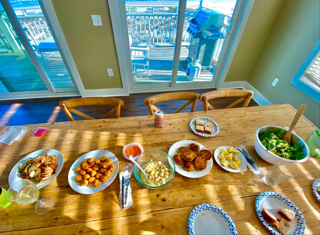 We cooked scallops, crab cakes, and hushpuppies with sides. Of course there are an abundant amount of PB&J’s for the younger diners. The seafood and delicious hush puppies came from St. Joe Shrimp Co.