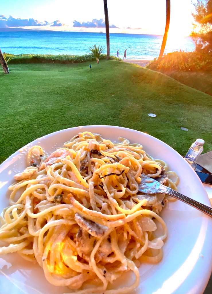 After snorkeling at beautiful Wakapu Beach in Wailea, we stopped for some take-out from highly recommended Paia Fish Market. We split an order of seafood pasta and clam chowder and headed back to the our patio for another Maui sunset.